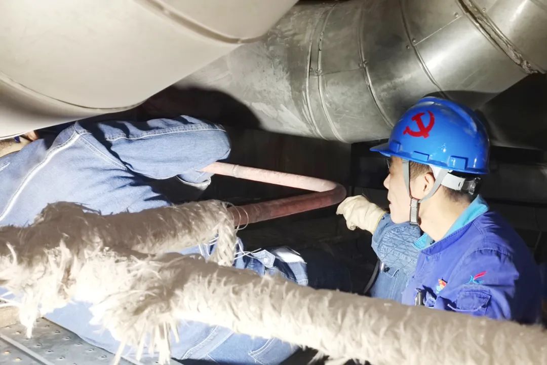 在家准备休息的检修人员,得知情况后,设备维修党支部书记、部长夹书美立即在部门群里发送了抢修通知,机务检修班班长正值休假、当天也处于高烧状态,但仍然毫不犹豫报名返厂参加抢修,连夜制定了抢修方案,报公司审批同意后立即组织抢修。