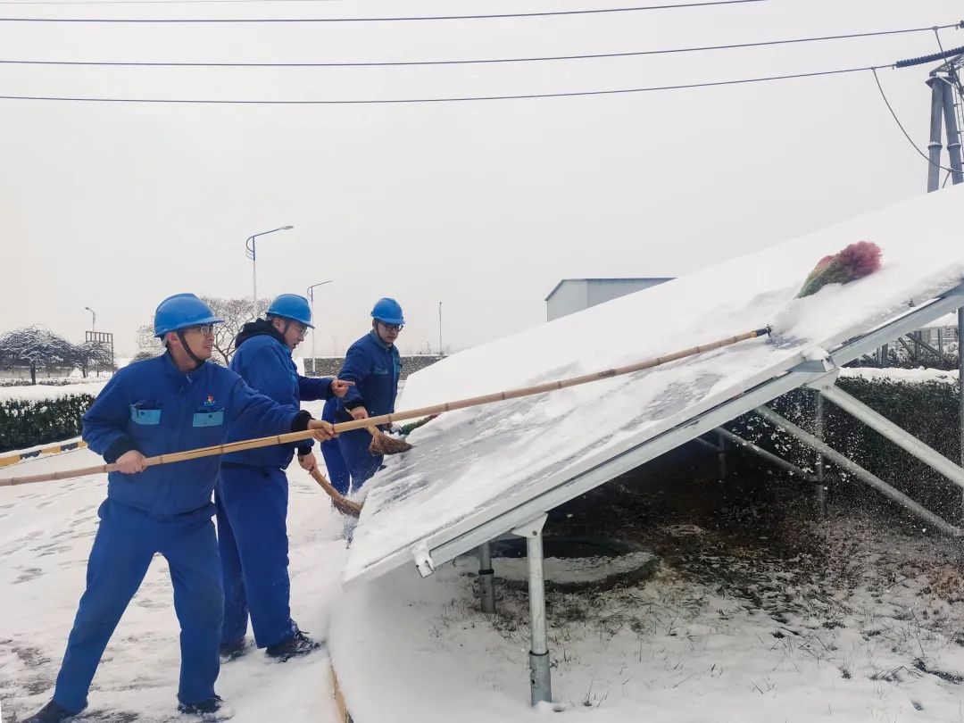 “光伏板积雪严重,严重影响发电效率,再多积一些可能会对光伏板造成损伤,请尽快处理。”徐矿发电公司分布式光伏板前,在供热管道巡检的运行管理部主值高雨正联系检修部门处理积雪,电气检修人员第一时间响应,顶风冒雪备齐工具前来,迅速开始清扫作业。