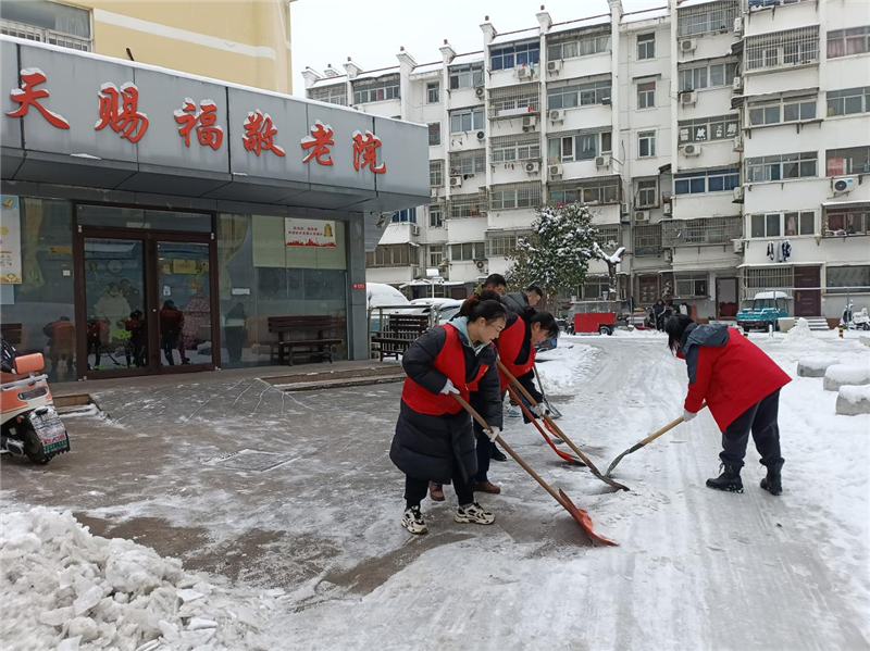 特殊群体,重点关注。针对独居老人、失独家庭、残疾人等特殊群体,积极开展帮扶,协助做好防冻保暖措施。各社区通过电话联系、上门入户的方式,对特殊群体进行关心关爱,嘱咐他们降雪路滑注意出行安全,注意做好防寒保暖,并询问他们是否有生活上的困难需要帮助。同时,重点针对老人较多的老旧小区,优先做好清雪除冰工作,切实保障老人出行安全。其中黄山垅社区还专门组织党员到天赐福养老院,为其清扫积雪,铲除冰层。“真的太感谢了,这么冷的天还惦记着我们,感觉心里特别温暖!”80多岁的李大爷在门口看着大家忙碌的身影,感动地说道。