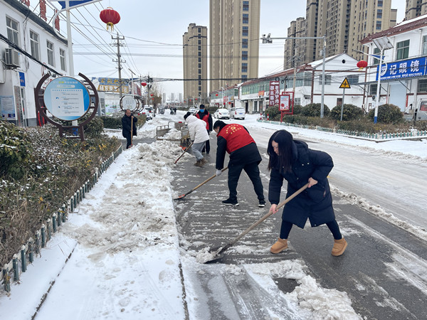 在破冰除雪现场,拾屯街道党员干部和志愿者们全员出动,他们不畏严寒、干劲十足,带着工业盐、铁锹、扫帚等清雪工具,迅速投入到扫雪除冰行动中来,全力争当“排头兵”。通过采取“人机结合”的方式,拾屯街道持续加大对拾新路、天齐路北延等重要路段及人车流动密集区域的破冰除雪工作,经过几个小时的辛苦劳作,辖区内主要车辆通道、人行通道等地积雪全部清扫完毕,用实际行动守护居民安全出行。
