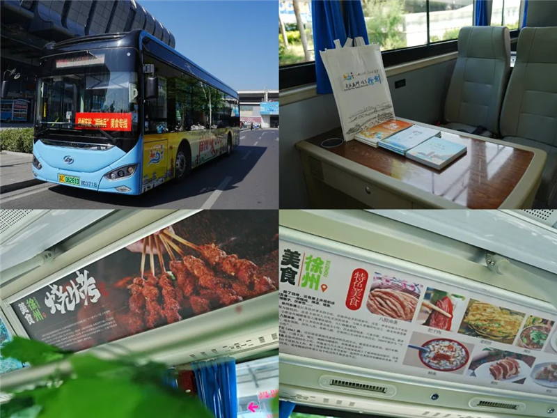 徐州公交集团不仅给专线贴上“徐州站、徐州东站特种兵美食专线”主题鲜明的标识牌,还在车厢围板拉手张贴徐州特色美食介绍图,走进美食专线车厢,映入眼帘的便是车厢两侧让人垂涎欲滴的徐州特色美食,烧烤、地锅鸡、东坡肉、把子肉、烙馍卷馓子、辣汤+煎包……各色菜肴有了属于徐州独特的风味,游客们可乘坐公交走遍徐州美食打卡地,尝遍徐州美味。
