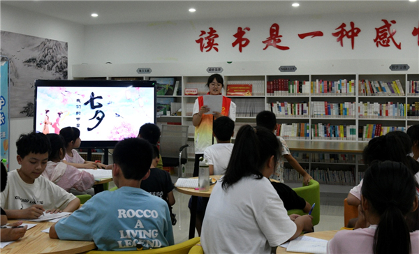 书屋内,宣讲员用生动的语言描绘着七夕节的美丽传说,让孩子们仿佛置身于那古老而浪漫的情境之中。孩子们聚精会神地听着,他们的眼中闪烁着对传统文化的敬仰和好奇。