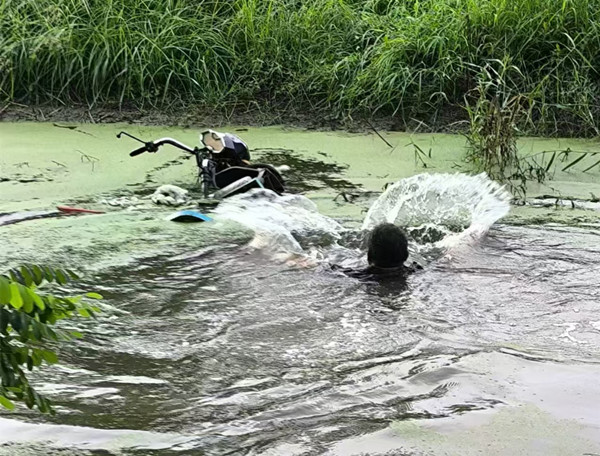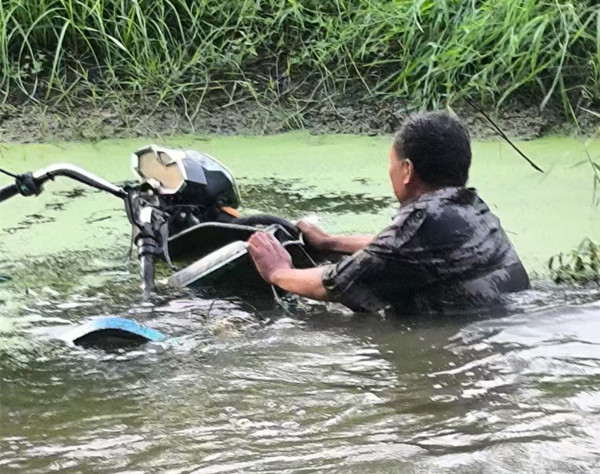 当天下午,大屯街道徐庄社区孙来运老人趁着天气晴好去地里干农活,不曾想突然下起大雨,老人便急匆匆骑上电动三轮车准备返回家中,却不慎发生了意外。“当时又打雷又下雨,我赶紧往后倒车,一个没注意就倒进了河里。”孙来运老人家的玉米地正好在一片河塘边上,由于最近一段时间雨水增多,水面涨到了两米多。“我都70多岁了,腿脚不灵光了,根本游不动,我就趴在车上,水太深了,我戴的草帽子都漂起来了。”