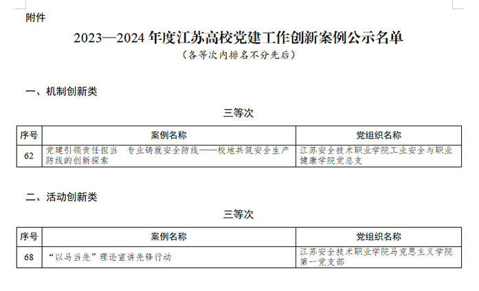 新华报业·中国江苏网讯 近日,在省委教育工委2023—2024年度江苏高校党建工作创新案例评选中,江苏安全技术职业学院2项案例获奖。其中,《党建引领责任担当 专业铸就安全防线——校地共筑安全生产防线的创新探索》荣获机制创新类三等次,《“以马当先”理论宣讲先锋行动》荣获活动创新类三等次。