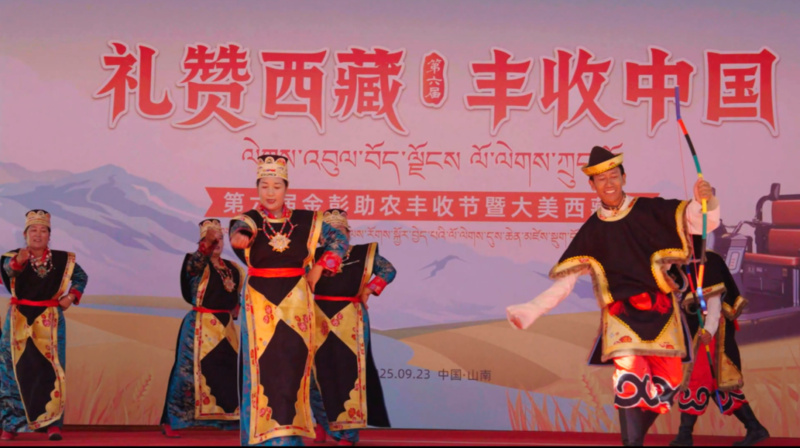 在庆丰收环节,二十位藏族村民代表载歌载舞,展现了雪域高原独具特色的民俗风情和丰收喜悦。