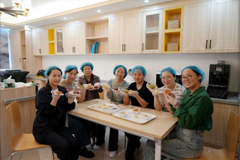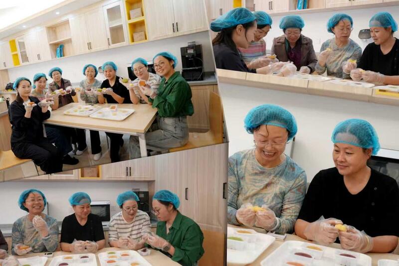 手工制作环节,退休职工代表围坐成圈,兴致盎然投入创作:有的将冰皮剂子揉圆按扁,裹入馅料后细致推捏收口;有的在模具内撒上熟糯米粉,放入月饼坯按压;遇操作难题时,大家互相支招协助,现场揉面声、谈笑声与淡淡奶香味交织,氛围温馨融洽。“以前中秋都是买现成的月饼,没想到还能和大家一起动手做冰皮月饼!”退休职工代表周师傅拿着刚做好、裹着保鲜膜的冰皮月饼说道,“这冰皮吃起来软糯不腻,还带着淡淡的奶香味,比买的更有意义。公司一直记着我们,这样的活动特别暖心,退休生活也不孤单。”