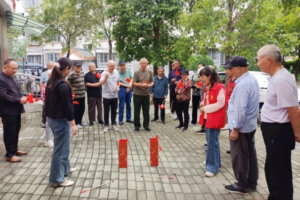 活动在齐声合唱《我和我的祖国》的歌声中正式拉开帷幕。社区精心设置了投壶、趣味保龄球两项经典又适合老年人的娱乐竞技项目,兼顾趣味性与安全性。在投壶区,工作人员早已摆放好了投壶和箭矢,老人们轮流上阵,有的凝神瞄准、有的轻手投掷,每当箭矢成功入壶,现场便响起阵阵欢呼声和掌声。72 岁的王大爷第一次参与投壶,连续投中两箭后难掩兴奋:“这次活动太有意思了,既考验手眼协调,又能和老邻居一起乐呵,感觉自己年轻了好几岁!”