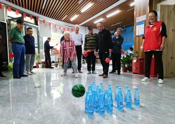 另一边的趣味保龄球区同样人气高涨。工作人员提前将10个矿泉水瓶装满水当作“球瓶”,按照传统保龄球的三角形阵型整齐摆放,还特意准备了软质皮球——既能保证游戏体验,又能避免运动中可能出现的撞伤风险,尽显对老年人的贴心考量。68岁的李阿姨眼神专注,第一次投掷就击倒了7个“球瓶”,她笑着说:“这个项目好,不用跑不用跳,还能练瞄准,玩着玩着就开心了!”
