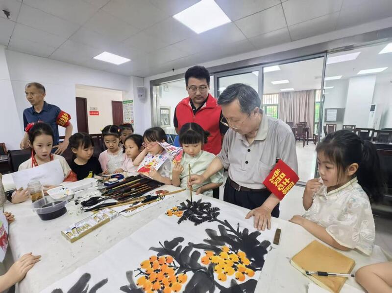 桌旁,一群天真烂漫的孩子凝神观画,捧着自己的画作轻声交流,稚嫩的眼眸里满是对传统书画艺术的好奇与向往。老艺术家以笔为媒,坚守文化根脉;孩子们以心为壤,承接传承活力。在双节的氛围里,老少携手,以墨香为纽带,绘就了一幅“家团圆、国兴盛”的美好图景,让传统文化在传承中焕发光彩,为双节添上一抹醇厚的文化底色。