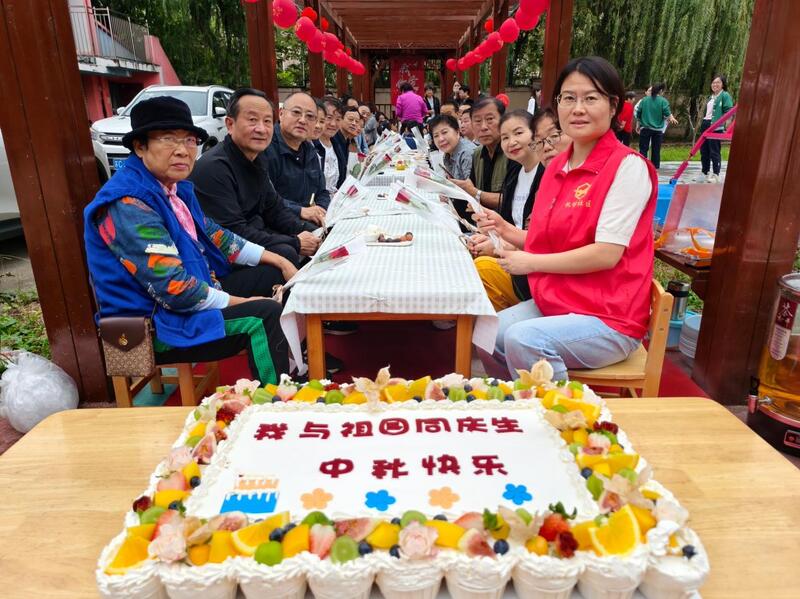 活动现场最吸睛的,莫过于桌上那款精致的大蛋糕——“我与祖国同庆生 中秋快乐”的字样醒目亮眼,新鲜水果围绕四周,色彩鲜活诱人。社区志愿者与居民们一同围拢蛋糕,切分的是甜蜜,传递的是对节日的期盼,更是对祖国的真挚祝福,每一口都饱含幸福滋味。