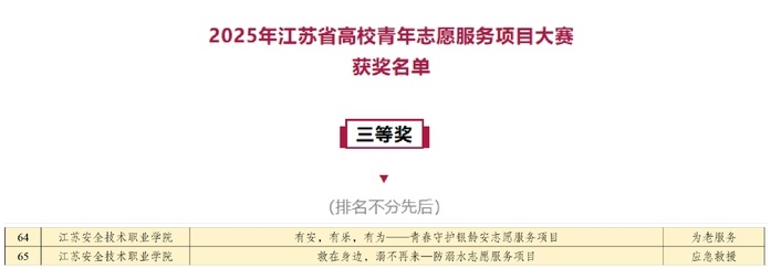 新华报业・中国江苏网讯 近日,2025 年江苏省高校青年志愿服务项目大赛在南京审计大学圆满落幕。本次赛事由共青团江苏省委、江苏省青年志愿者协会主办,聚焦乡村振兴、基层治理、公益创业等重点领域,吸引全省115所高校的384个志愿服务项目同台竞技。历经多轮筛选与路演答辩,江苏安全技术职业学院的“有安,有乐,有为——青春守护银龄安志愿服务项目”与“救在身边,溺不再来——防溺水志愿服务项目”成功入围决赛,双双斩获三等奖,展现了该校在青年志愿服务领域的专业实力与责任担当。