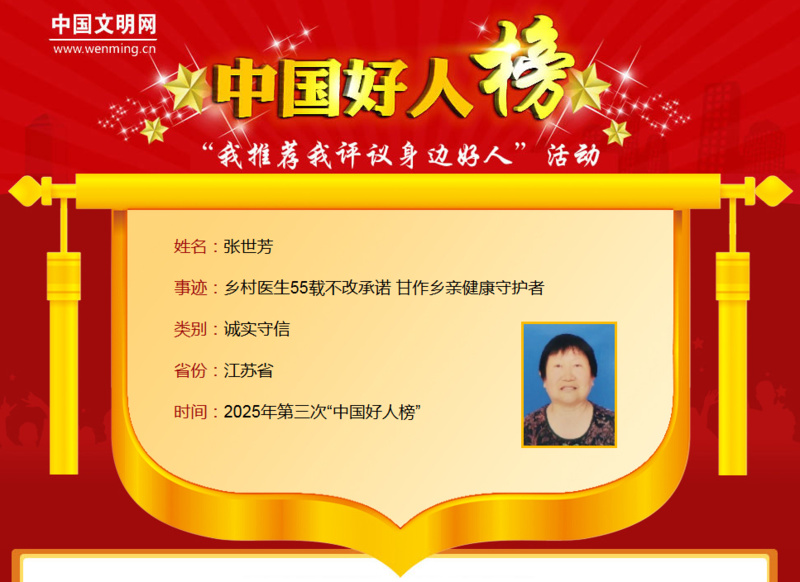 新华报业・中国江苏网讯(记者 张扬 通讯员 李晨 孙梦梦)10月15日,2025年第三次“中国好人榜”在新疆阿克苏正式发布,来自徐州铜山区马坡镇双楼村的73岁退休村医张世芳,以半个世纪扎根乡村的坚守,获评“诚实守信好人”。消息传回村里时,不少村民激动不已,纷纷念叨着“这份荣誉她实至名归”。这样真情实感的认可,是对她55年守护村民健康的最好回应。