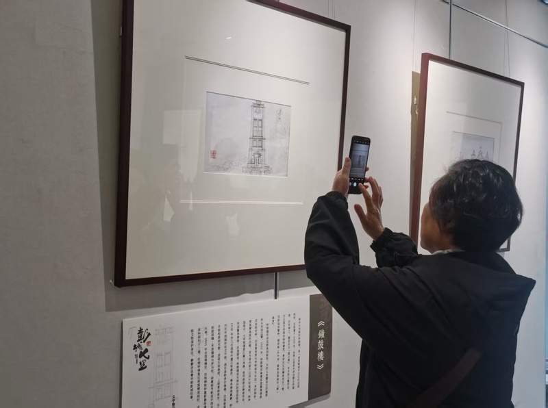 展览现场,精心绘制的钢笔画作品风格独特,虽属钢笔画范畴,却融合机械制图的精准,一笔一划皆追求“形似且神似”。从新石器时期的下圆墩遗址,到汉唐至民国的历史建筑,杨春茹用细腻线条勾勒出古建的飞檐斗拱、门楣纹饰,连砖瓦图纹走向、房脊吻兽造型都清晰可辨。更具特色的是,每幅画作旁均配有文史专家撰写的解说文字,观众观画时可同步了解景物源流与背后故事,仿佛翻开一部“立体的徐州历史书”。