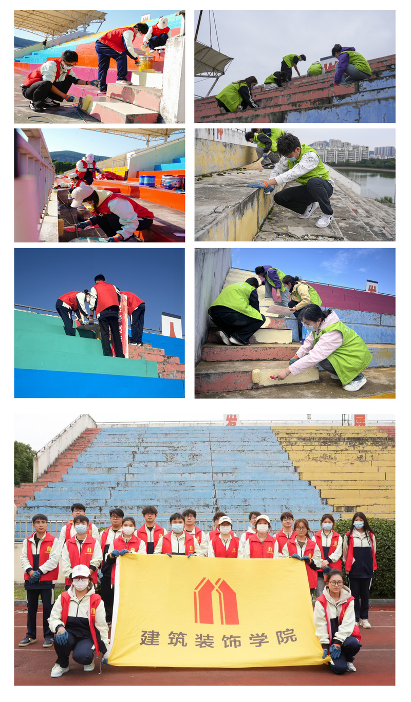 如今,昔日黯淡的看台已完成华丽蜕变:明快的色块如琴键般沿阶梯铺开,为校园注入蓬勃的青春朝气。这一成果的背后,是建筑装饰学院与艺术设计学院通力协作,推动劳动教育与专业教育深度融合的实践探索。