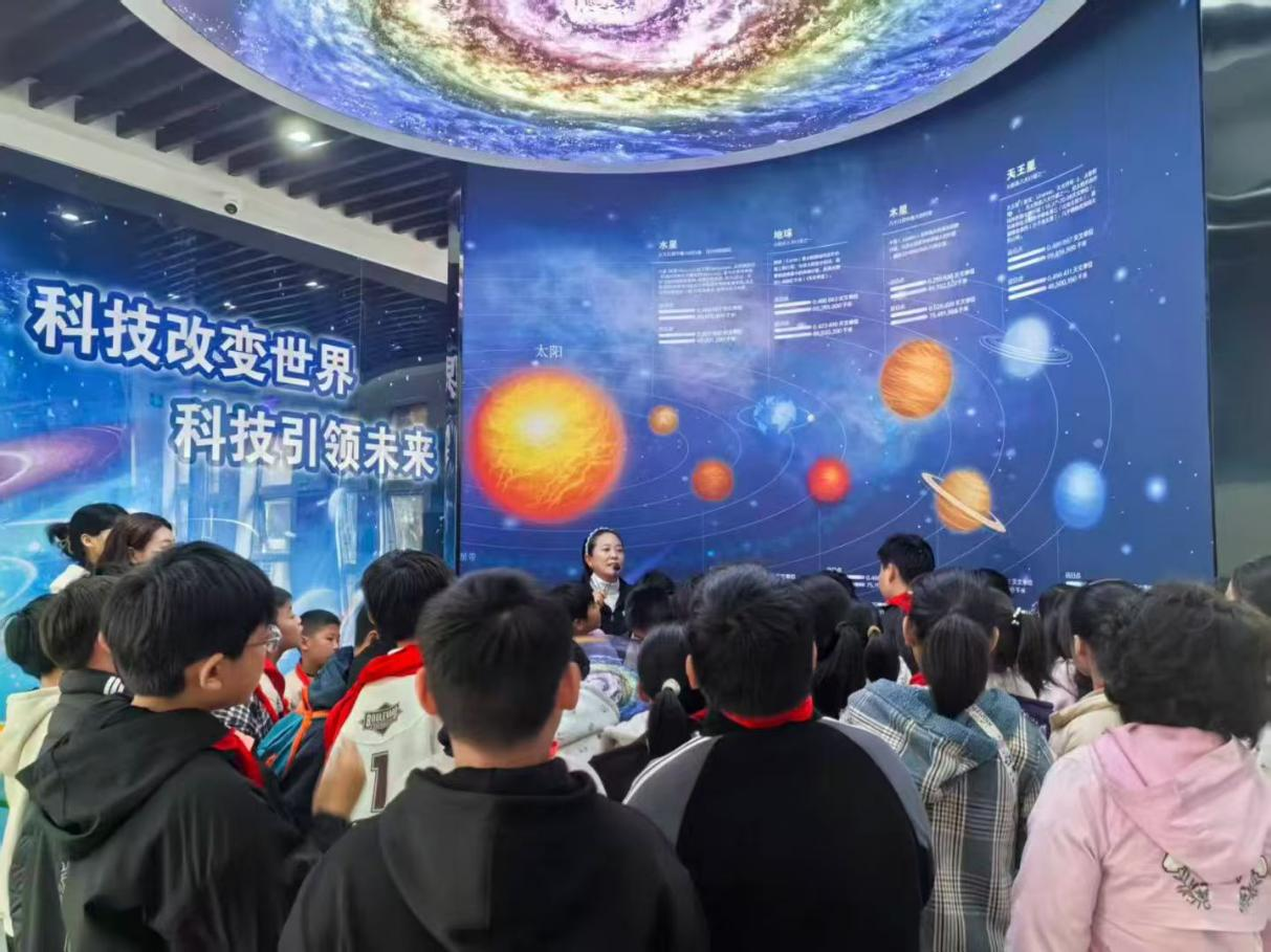 在新沂科技馆,师生们开启多领域科学探索盛宴。他们聆听讲解人员解析各类科学原理,观看闪电模拟实验,在“自己拉自己”互动装置和沉浸式森林投影通道中感受科学乐趣。在航天主题展区,通过太阳系仪直观认知天体运行,操作航天科学仪器,在“科技改变世界,科技引领未来”的氛围里领略航天科技魅力。