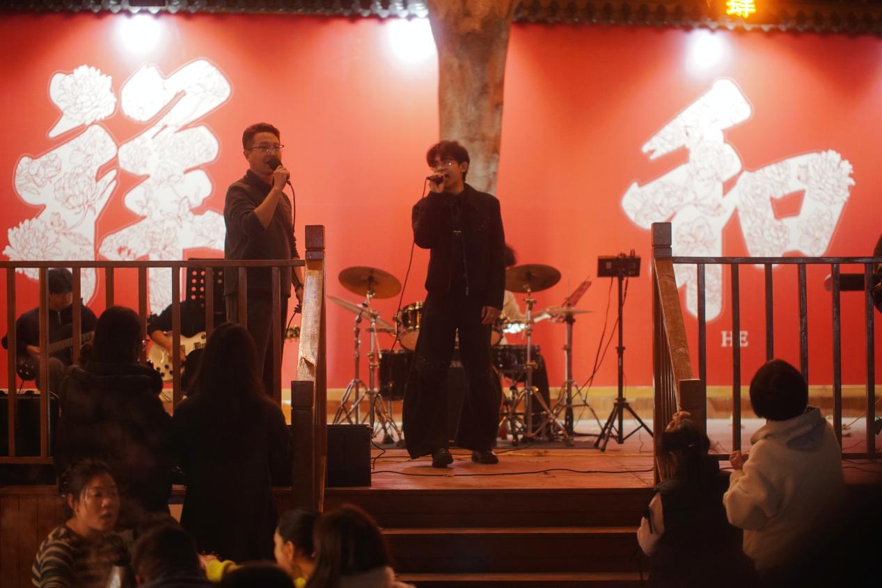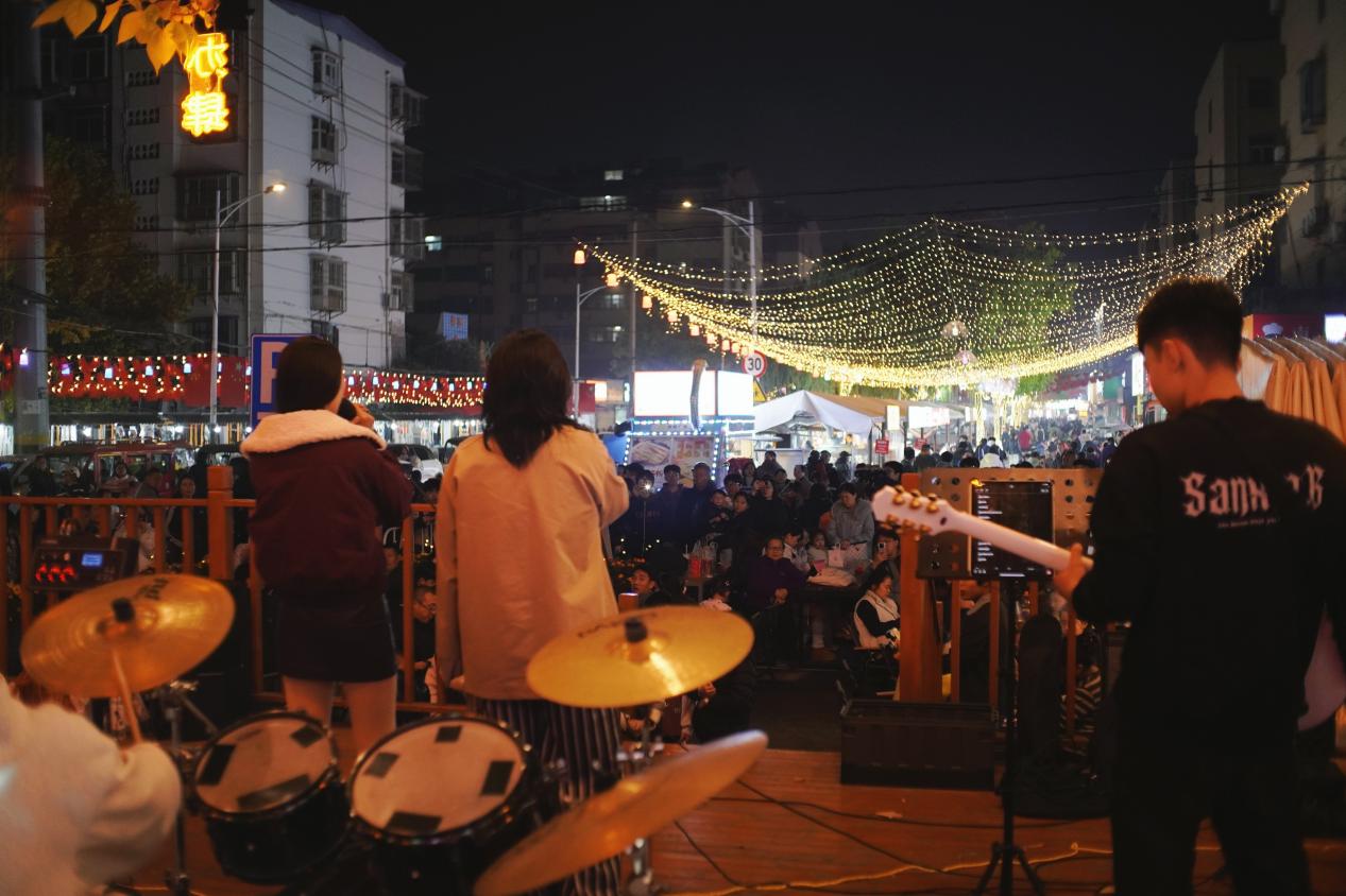 夜市北端的小舞台上,共建高校徐州工业学院“纯蓝乐队”带来的现场表演,将活动氛围推向高潮。《不再犹豫》《鲜花》《真的爱你》等曲目轮番上演,热血旋律与温柔曲调交替,摊位前的谈笑声、锅铲碰撞声交织成一曲独特的夜市“交响曲”。“边听喜欢的歌边吃美食,这种氛围太治愈了!”参与活动的青年小李说。原本陌生的青年们随着节奏轻哼,在分享校园趣事、交流美食攻略中逐渐熟络,让夜市成为青年社交的新场景,进一步拉近了青年与城市的心理距离。