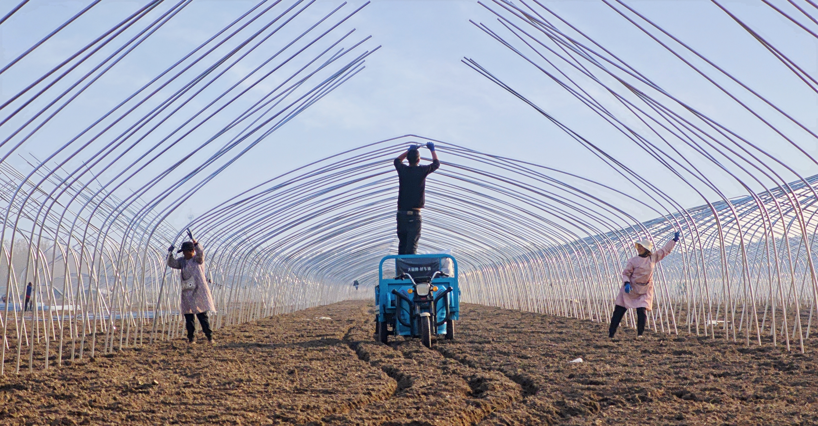 负责大棚施工的魏培团队,是搭建各类大棚的专业队伍。“来到先放线、找点、打眼同步进行,这边先打眼、栽管,上面再连管。”魏培介绍道,目前工地有30多名工人奋战,团队还兼顾着其他区域的搭建任务,“时间紧、任务重,就分开工作。”据他估算,仅果园村这150亩地,搭建大棚所需的弯管、直管就接近3.5万根。