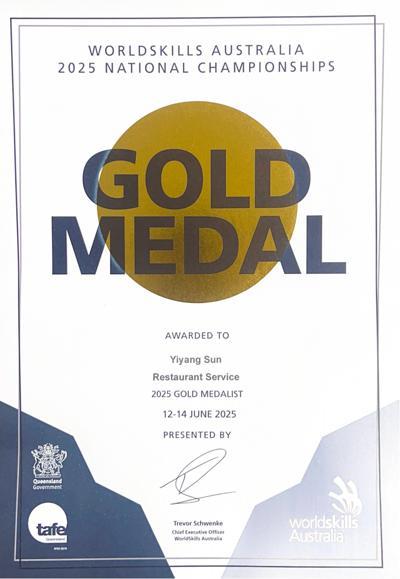 曾经的孙逸杨,是众人眼中“做事扭捏、胆小怕事”的女孩。为突破自我,她主动申请在学校活动中当众发言,利用假期赴上海米其林餐厅实习,在高强度的实战中锻炼沟通能力与应急处理技巧。1500多个日夜的沉淀,让她完成了华丽蜕变。2025年5月,她受澳大利亚技能组织邀请,前往参加澳大利亚全国锦标赛,与澳大利亚的技能高手们同场竞技,一举拿下第一名,获得人生第一块金牌。这次胜利,不仅是一次实力的证明,更是对她多年付出的巨大肯定。
