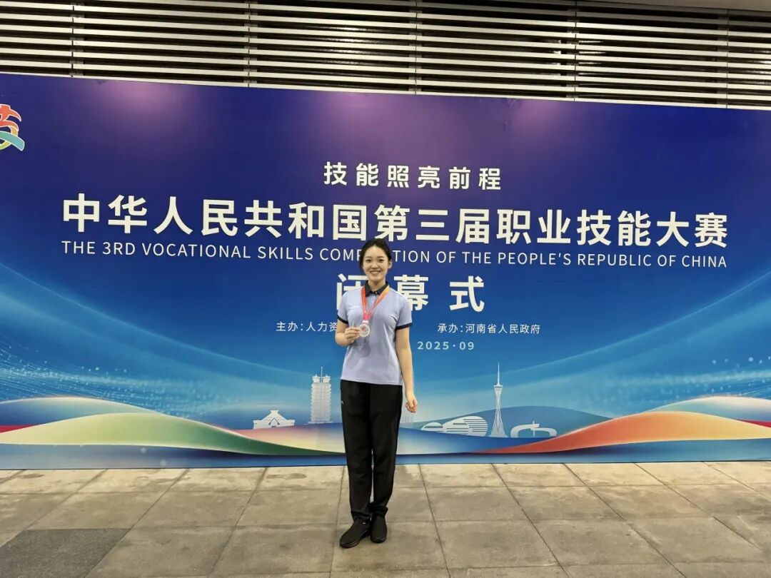 2025年9月,在中华人民共和国第三届全国职业技能大赛赛场上,面对3天的密集考核,她从容不迫:用流利的英语与评委、“客人”顺畅沟通,精准推荐餐酒搭配;调制鸡尾酒时手法娴熟,风味层次分明;提供零点服务时,从入座引导到餐具摆放,每一个细节都尽显优雅专业;即便遇到模拟客诉场景,也能沉着应对、妥善解决。当最终成绩公布,银牌的荣耀照亮了她的脸庞,那个曾经羞涩的女孩,已然成长为技艺精湛、落落大方的行业翘楚。