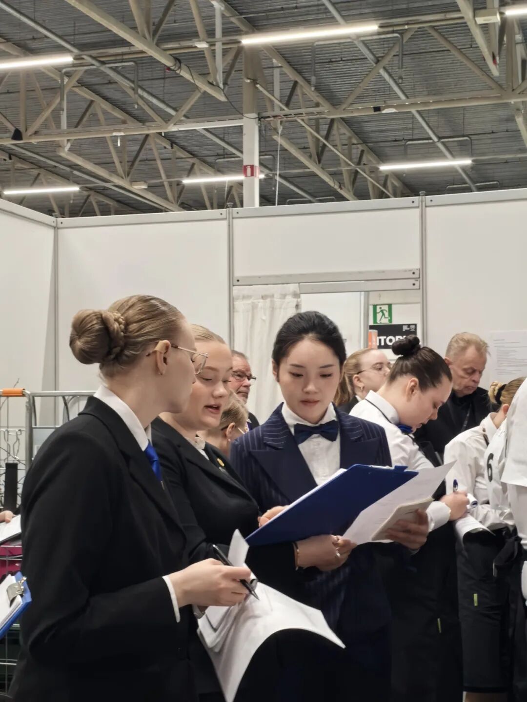 面对理论难关,她选择“愚公移山”。上千个专业术语、繁琐的服务流程,被她写成密密麻麻的便签,贴满了书桌。利用一切碎片时间反复背诵,甚至熬夜模拟英语对客场景,直到对答如流。面对技能壁垒,她相信“熟能生巧”。她每天提前3小时到训练室,只为反复练习托盘的稳定性与餐具摆放的精准度。调制鸡尾酒时,她逐一滴试配比,寻找风味的最佳平衡;练习咖啡拉花时,手腕酸痛到抬不起来也不肯休息,直至每个动作都成为无需思考的肌肉记忆。针对国赛的侍酒服务模块,她专门研究不同产区葡萄酒的风味特点,反复演练醒酒时间与温度控制,确保每一次服务都专业得体。
