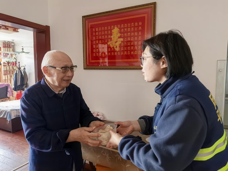 不久后,一盘盘形态各异却饱含真情的饺子整齐排列,静待下锅。当热气腾腾的饺子新鲜出锅,工作人员第一时间将这份温暖送到社区高龄老人和户外工作者手中。缕缕饺香氤氲街巷,传递着社区大家庭的关爱与敬意,串起了守望相助的深厚邻里情。