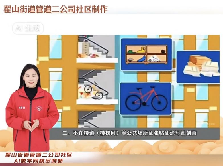 “AI 数字网格员”赋能社区治理,治理手段“新升级”。在权责理顺、党建赋能的双重支撑下,翟山街道进一步探索科技赋能路径,以数字化手段破解基层治理人力不足、服务触达不深等难题,让减负成效真正转化为治理效能。今年,街道管道二公司社区正式推出并应用AI数字网格员形象“晓娇”,打造 “线上+线下” 双轨并行的智慧治理模式,为社区服务注入科技动能,让政策传递更接地气、服务触达更具温度。通过虚拟主播的鲜活形象,成功弥合 “数字鸿沟”,将党建知识、政策解读、便民通知等内容转化为生动有趣的动画短视频。自上线以来,“晓娇” 视频总播放量已突破3万次,单条最高播放量达4300余次,社区宣传效能实现质的飞跃,成为党组织服务群众的新窗口。数据显示,居民活动参与率同比提升62%,政策知晓率增长45%,社区居民网格群新增成员超100人。“AI 数字网格员”的应用,也让线下社区网格员从繁杂的宣传通知工作中解脱,有更多时间和精力服务重点人群、解决重点问题,实现治理精度与服务温度的双重提升。