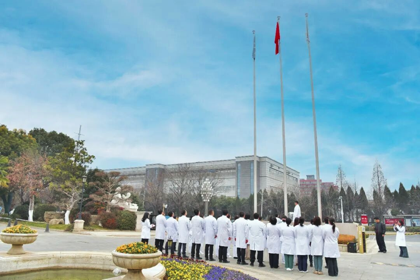 上午9时,升旗仪式在雄壮激昂的国歌声中正式拉开帷幕。鲜艳的五星红旗迎着朝阳冉冉升起,全院党员代表整齐列队、肃立致敬,目光紧紧追随着国旗的方向,心中涌动着对伟大祖国的无限崇敬与热爱,更深刻感悟到医务工作者“护佑生命、守护健康”的使命与担当。