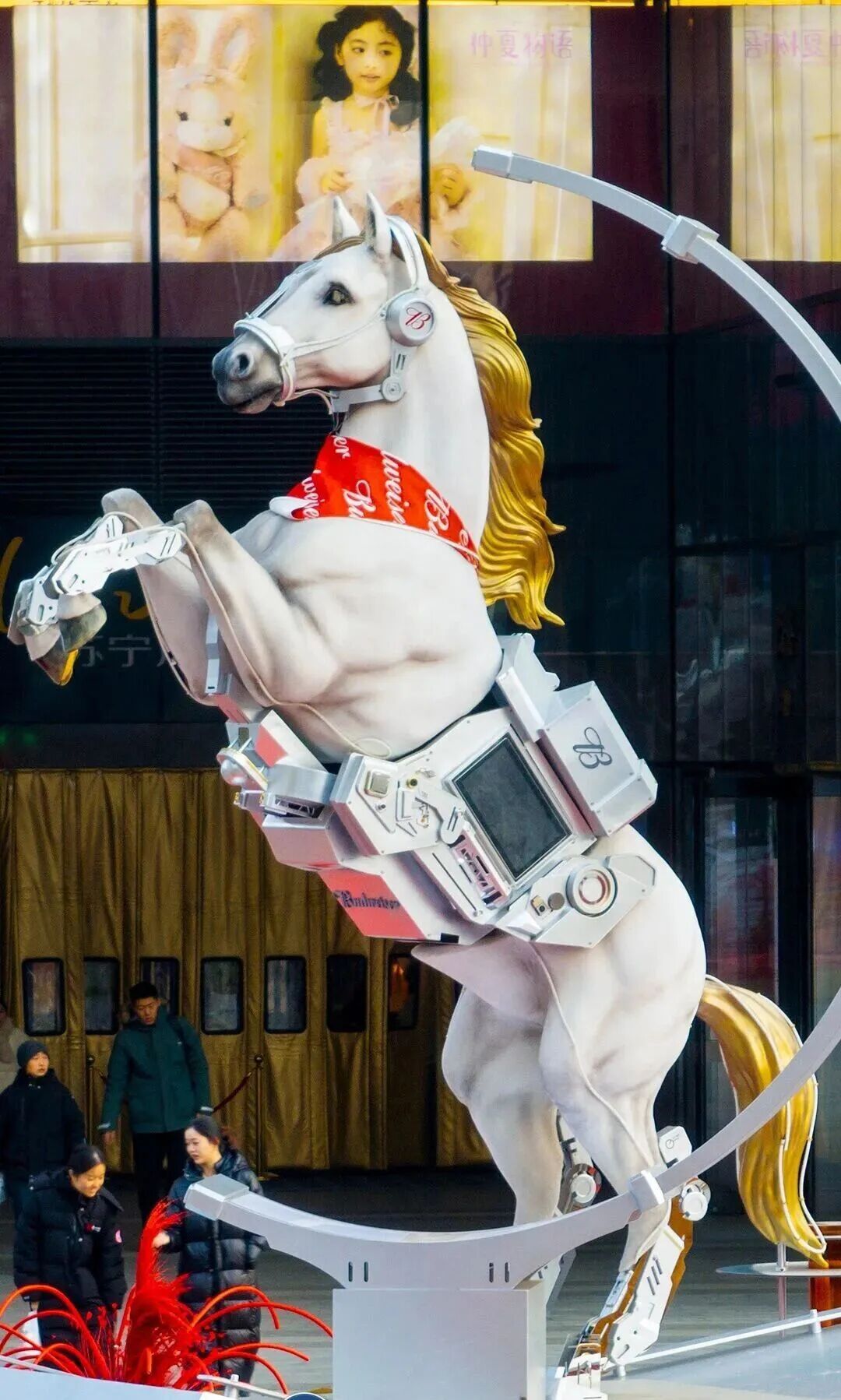 在市中心苏宁广场c门前,一尊“星璇马”雕塑破风而立,成为商圈里一道亮眼的风景线。这匹“赛博神驹”通体雪白,昂首嘶鸣、奔腾向前,金属质感的装甲贴合流畅的肌肉线条,关节处的机械结构清晰可见,科技感拉满。前蹄奋力扬起的瞬间,仿佛要冲破建筑边界,向着城市未来疾驰而去,尽显现代都市的蓬勃活力。