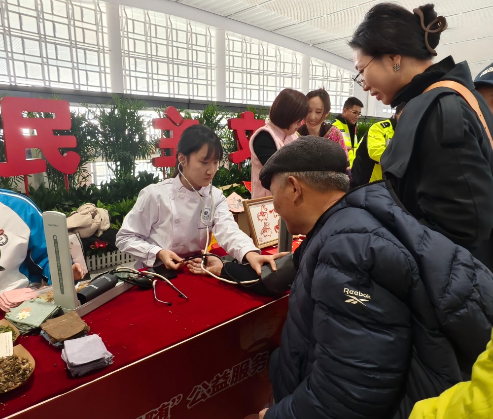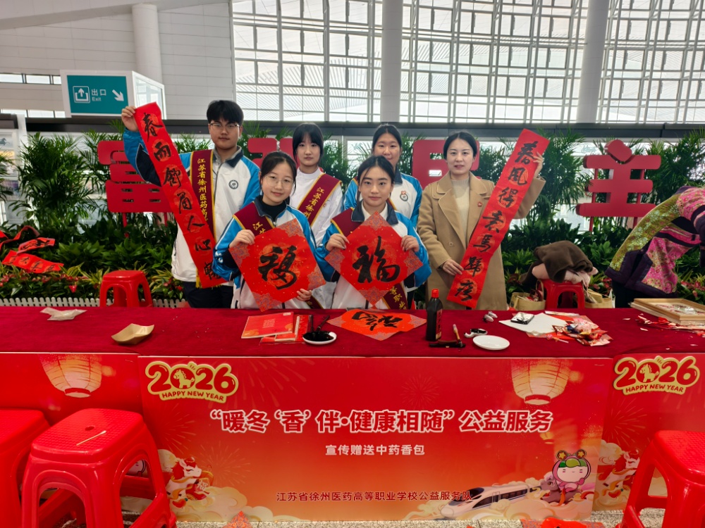 新华报业·中国江苏网讯 情暖旅途,志愿先行。2月2日上午,2026年江苏省青年志愿者“暖冬行动”集中活动在徐州高铁站温情启幕。作为本次“暖冬行动”的重要参与力量,徐州医药高职校青年志愿者在郑欣欣老师的带领下,结合医药专业特色与志愿服务需求,精心设置服务摊位,推出写赠春联、健康义检、中药香包制作三大暖心服务,将传统文化与健康关怀融入志愿行动,让春运旅途满溢温情与暖意。