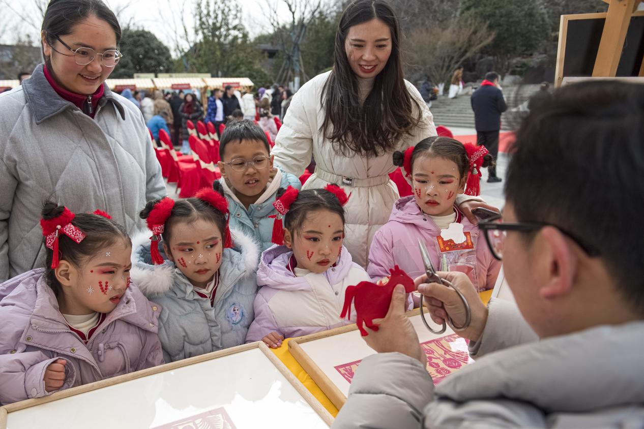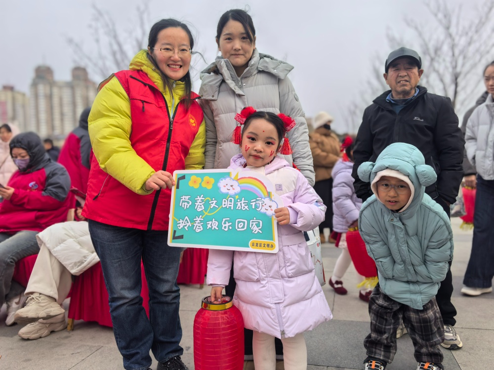 舞台一侧的互动体验区更是人气爆棚。云龙区书法家协会的名家们挥毫泼墨,将一副副饱含“龙马精神”“万事如意”等祝福的春联与福字送到市民手中;非遗展示区里,剪纸、面塑等传统技艺引得市民驻足,引人注目的是为张艺兴单曲《大花轿》创作封面的徐州剪纸传承人刘冠玉,他带来多幅以马为主题的创意作品,笔墨间尽显马年精气神,让市民感受到传统技艺与现代潮流的碰撞;云龙区新时代文明实践中心志愿者化身“文明使者”,通过互动宣讲推进移风易俗,让新风尚浸润人心。中国银行徐州分行搭建的金融知识趣味游戏区同样热闹,玩飞盘赢金融知识小礼品、大转盘小挑战等互动项目,让市民在欢声笑语中学习金融知识,现场氛围热烈而温馨。
