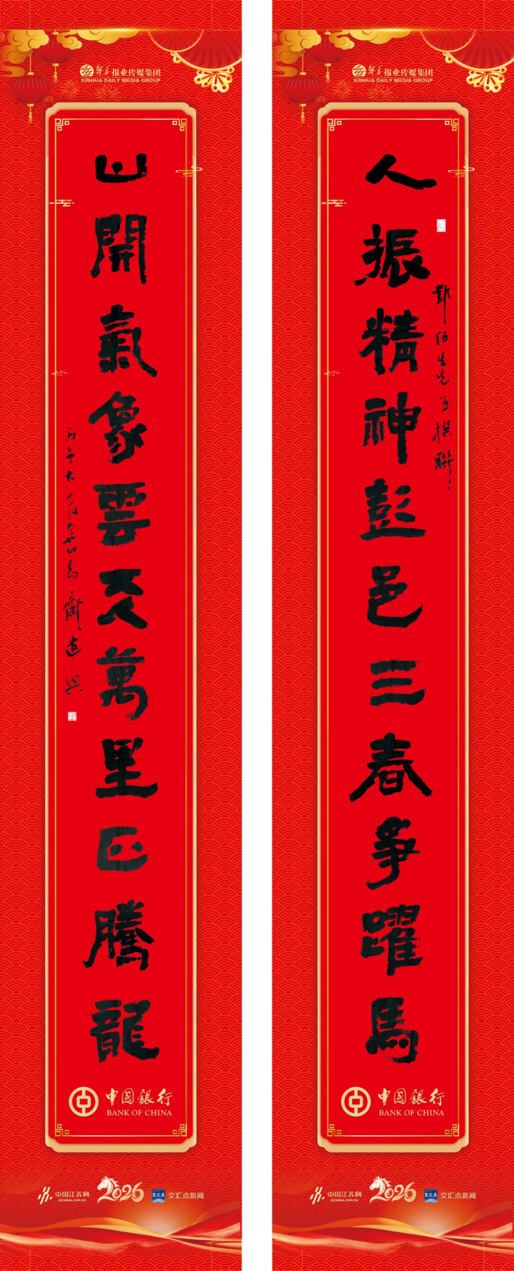 激昂的音乐响起,徐州市委宣传部副部长窦铜顺,中国银行徐州分行党委书记、行长蒯海涛,新华日报社徐州分社社长成岗,徐州市云龙山风景名胜区管理委员会副主任邓建新,云龙区委宣传部副部长、区文明办主任葛业良,彭城街道党工委书记荣建文、新华日报交汇点大平台区域传播部主理人戚阜生,云龙区文化体育和旅游局副局长张美丽等领导嘉宾共同为巨幅春联揭幕。今年的徐州云龙山春联由江苏省书协副主席王伟林亲笔题写,上联“人振精神彭邑三春争跃马”、下联“山开气象云天万里正腾龙”,既契合马年新春主题,更饱含对徐州发展的美好期许。