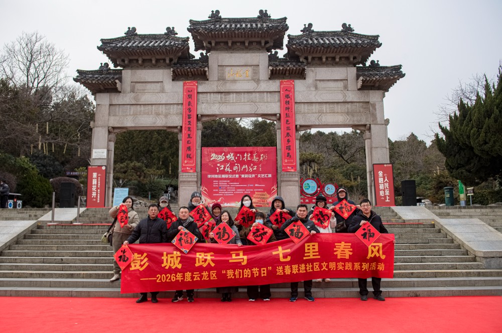 新华报业·中国江苏网讯(记者 张扬 彭颂珂)春临古彭添锦绣,联映龙山送福来。2月6日,2026年“城门挂春联 江苏开门红”徐州地区揭联仪式暨“茉莉花开”文艺汇演在云龙山举行。活动以春联为媒串联传统文化与新春祝福,通过巨幅春联揭联、“茉莉花开”文艺直通车展演、非遗展示、“我们的节日·春节”现场送福、金融知识互动等丰富环节,为市民送上满满年味,更让“彭城七里”城市名片在传承中焕发新活力。