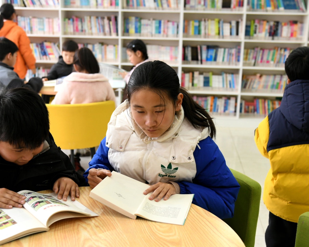 书架前,有孩子踮着脚尖,目光搜寻着属于自己的“宝藏”;阅读桌旁,更多的小身影已然沉浸其中。邓允睿与邓允寒兄妹俩挨坐着,哥哥完全沉醉于《格林童话》的奇幻世界,妹妹则通过《小牛顿科普馆》的插图,睁大了探索科学奥秘的眼睛。另一侧,张安琪、张冬宸姐弟同样专注,姐姐从《小故事大道理》中若有所思,弟弟随着《故事大王》的情节时而微笑。这一刻,翻动的书页如同扇动翅膀的蝴蝶,带领童心在知识的花园中流连忘返。