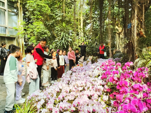 午后,孩子们走进植物园热带植物馆,宛若置身生机盎然的梦幻雨林。蝴蝶兰竞相吐艳,各类奇花异草郁郁葱葱。社区志愿者化身“自然向导”,细致讲解植物特性与生长知识,孩子们边走边看、踊跃提问,在绿意环绕中探索自然奥秘,在沉浸式体验中厚植生态情怀,欢声笑语洒满春日小径。