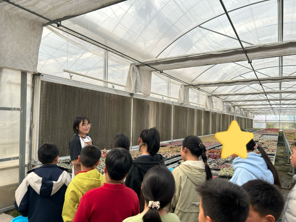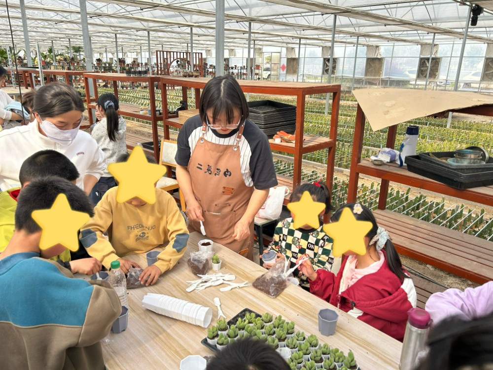 清明时节,草木萌动,正是亲近自然、感受农耕乐趣的好时机。活动伊始,孩子们在工作人员的带领下,统一前往睢宁县梁集镇现代农业产业园,开启一场别开生面的多肉种植体验。园内绿意盎然,一盆盆形态各异的多肉生机勃勃,孩子们满怀好奇与期待,围在专业农技人员身边,认真聆听松土、选盆、栽苗、浇水的技巧讲解。