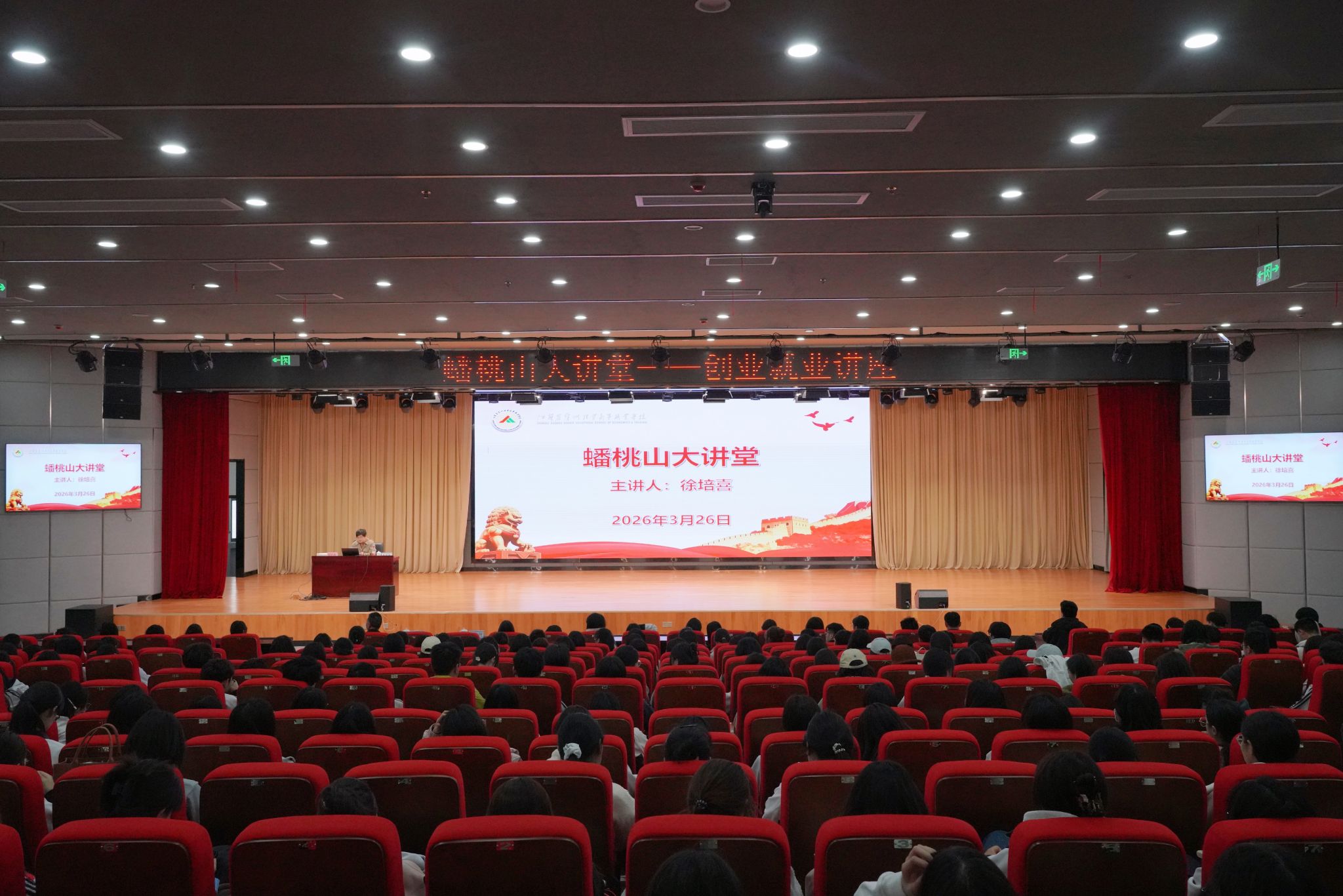 中国江苏网讯 为深入弘扬创业精神、劳动精神、工匠精神,全面强化师生思想政治引领,积极引导广大青年学生树立正确的创业观、就业观、择业观,3月26日,由学校工会、招生就业办公室联合主办的“蟠桃山大讲堂——创业就业讲座”在学校学术报告厅成功举办。本次讲座特邀杰出校友、徐州市外事服务有限责任公司董事长徐培喜主讲。徐培喜校友同时担任中国对外服务工作行业协会常务理事、徐州市人力资源服务行业协会会长、江苏省人力资源服务业十大领军人才、江苏省服务外包协会常务理事、徐州市总会计师协会副会长等重要职务,在人力资源服务领域拥有广泛的行业影响力。学校副校长张传娟及校长助理、工会主席丁会兵出席并主持活动,师生代表400余人共同聆听了这场精彩的专题讲座。