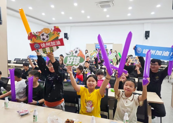 当晚7点10分,“燃情苏超·童享绿茵”未成年人观赛专场同步启动,30余名孩子在家长陪同下齐聚现场。志愿者通过苏超宣传片,用通俗的语言讲解球队阵容、足球知识,带领孩子们学习助威口号,“徐州队,加油!”的稚嫩童声铿锵有力,点燃全场热情。