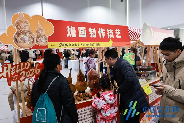 活动不仅“送岗位”,更“送政策”“送文化”“送年味”。现场设立非遗展示区,将招聘嵌入非遗市集与年节氛围,淮剧、步凤大麦酒、盐城鸡蛋饼等20余个非遗摊位亮相,技艺展演与非遗好物集中亮相,既让求职者沉浸式感受本土非遗的魅力,也增强了大家的归属感。手持木雕的李月阳笑容满面,她说:“一边找工作,一边感受家乡本土文化和过年气氛,选岗、逛集、赏文化一步到位,这种体验很特别、氛围很好。”