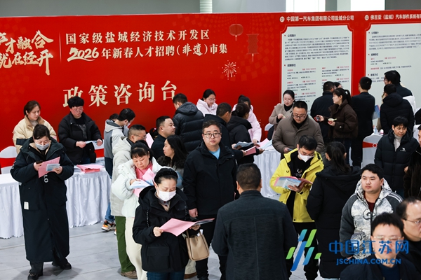 中国江苏网2月23日盐城讯 2月22日,农历正月初六,盐城国际会展中心D馆人头攒动、暖意融融,“产才融合 就在经开”国家级盐城经开区2026年新春人才招聘(非遗)市集火热举行。活动将人才招聘与非遗展示、年货市集、乐业安居等创新融合,让求职者在品非遗、赏年味的轻松氛围里“赶集寻岗”。
