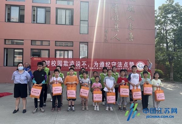 中国江苏网6月20日盐城讯 6月18日上午9点,盐城市亭湖区先锋街道健康路社区党总支、先锋街道关工委、江苏济洲律师事务所在亭湖区登瀛小学联合开展“对校园欺凌说‘不’ 为遵纪守法点赞”宣传活动。