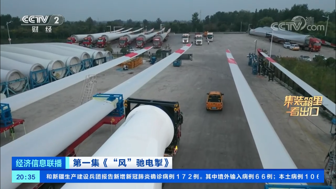 今年一季度,我国风力发电机组出口9499台,而单单一个叶片的长度就将近80米。在盐城一家风机叶片生产厂房内,巨大的风机叶片长度有76米,重量达到27吨。生产好的风机叶片会被运送到外面的堆场上,由半挂车运输出场,通过海运运往世界各地。