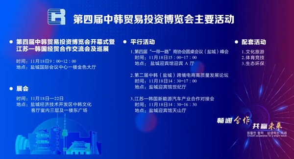 第四届中韩贸易投资博览会主题为“畅通合作 共赢未来”。11月18日上午,将举行博览会开幕式及巡馆活动,开幕式首次采用双会场模式,分别在盐城、首尔设置会场进行实时连线直播,拟邀请中国商务部与韩国产业通商资源部等政府机构、大韩贸易投资振兴公社与大韩商工会议所等商协会,并邀请外国驻华使节、著名跨国公司、世界500强与行业20强企业高管、专家学者以及媒体代表参会,一批重大项目将现场集中签约。