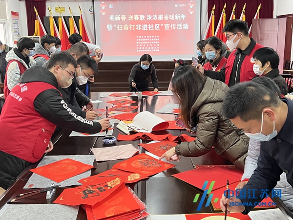 中国江苏网1月19日盐城讯 为了弘扬中华优秀传统文化,丰富群众的文化生活,营造喜庆、健康、和谐的节日文化氛围。1月13日下午,盐城市亭湖区五星街道雅和社区党委、关工委邀请辖区书法爱好者在社区新时代文明实践站举办了“迎新春送春联·浓浓墨香迎新年”暨“扫黄打非进社区”志愿宣传活动。