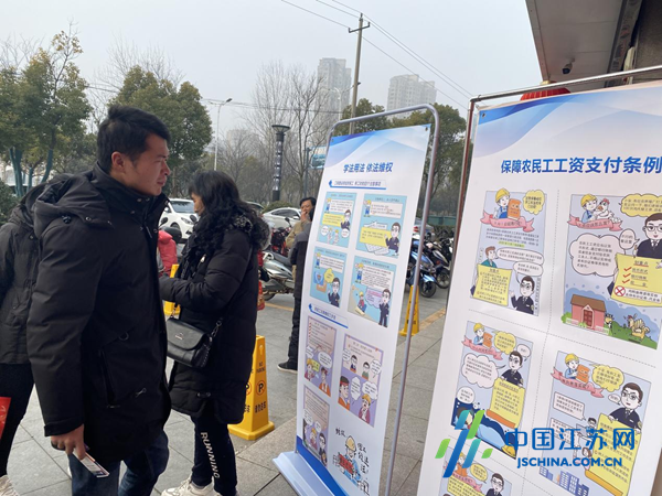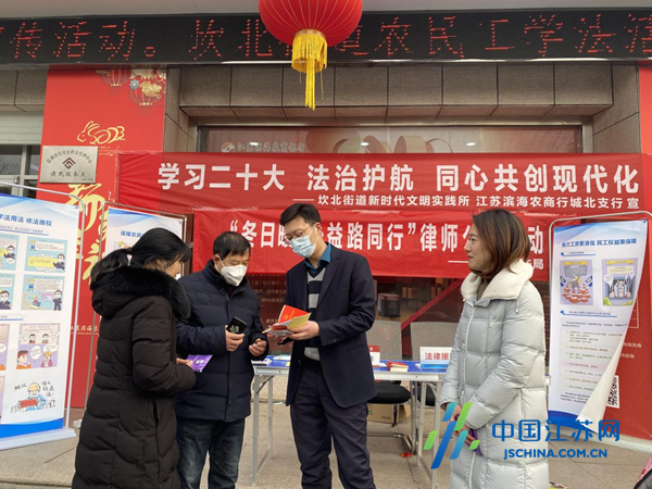 中国江苏网2月10日盐城讯 为教育和引导广大农民工知法守法、崇德尚法,进一步维护新就业形态劳动者合法权益,盐城市滨海县坎北街道新时代文明实践所联合街道司法所紧扣“学习二十大精神 法治护航奋斗路 同心共创现代化”主题,组织律师和普法志愿者走进企业、银行、社区,组织开展农民工学法活动周“三进”系列活动,引导民工学法用法,增强法治意识,受到农民工欢迎。