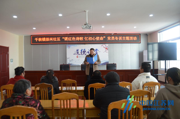 红色诗歌诵初心。“红军不怕远征难,万水千山只等闲……”伴随着激情澎湃的音乐,饱含深情的《七律·长征》诵读声从千秋镇振兴社区“诵红色诗歌,忆初心使命”党员冬训主题活动现场传来。千秋镇振兴社区党支部书记李进荣,党支部副书记赵华及三名党员代表轮番登台,为群众诵读诗歌。大家或慷慨激昂、气势恢宏,或声情并茂、感人肺腑,用声音表达自己的满腔热情和坚定信念,抒发了矢志不渝的红色情怀。