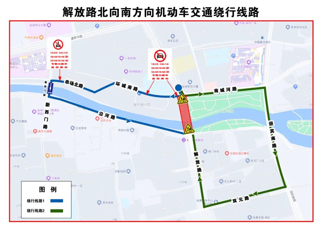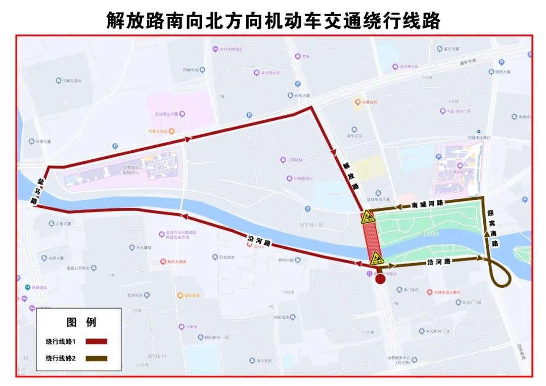 该公告已于2023年2月24日通过媒体对外发布,现从3月5日0时起对解放路解放桥道路实施全幅封闭施工。施工期间,解放路南城河路口、解放路沿河路口交通渠化也同步调整,请大家根据现场交通标志、标线指示通行。为方便您的出行,建议收藏以下两张绕行图。