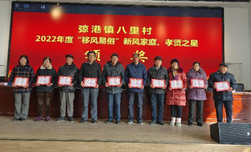 选树先进典型。村党总支组织开展道德讲堂,进行道德评比、星级家庭评选等活动,选树尊老爱幼先进典型。打造八里好人墙,墙上有“东台好人”黄国余义务法律援助的感人事迹、有老党员陈仁礼为抗击疫情捐款上万元的动人故事、还有为家乡公益事业建设捐款的10多名乡友名册。红色驿站里有带头引进新品种发展甜叶菊产业的先锋张荣仁,有带领村民废灶垦荒、改良土壤的先军李存山……通过先进引领,八里村连续五年跻身“江苏省文明村”方阵。