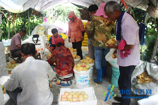 中国江苏网7月21日盐城讯 7月18日下午,东台市南沈灶镇果蔬椒乡现代农业产业园东侧的永丰果园里,空气里仿佛弥漫着甜甜的果香味,套袋的水蜜桃挂满枝头,几名戴着遮阳帽的妇女正在采摘,桃园里不时飘出欢声笑语。