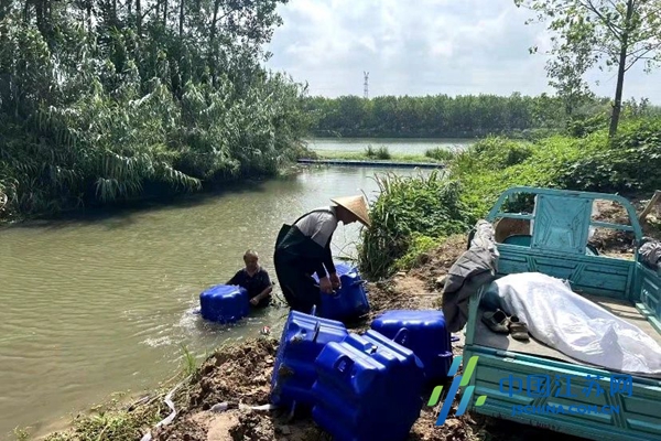 中国江苏网9月2日盐城讯 近日,盐城市大丰区南阳镇组织对王港河沿线支流二匡河、三匡河、四匡河、五匡河、六匡河等河道漂浮物进行集中清理,同时在干支流交汇口安装拦截浮筒,探索提升水环境新举措。