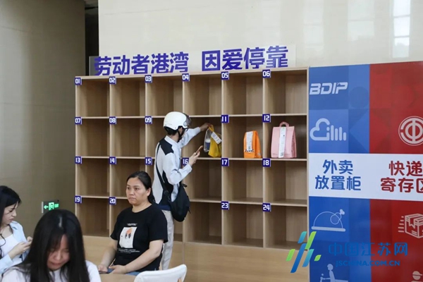 外卖员高胜说:“这里服务设施一应俱全,我每次送完外卖就会在这里休息一下,手机也能充电。现在,外卖置物架也进行了改造,大大提高了我们的工作效率,不再像以前接到客户电话说不知道外卖放在哪里、找不到的情况了。真的很感谢盐南总工会为我们提供这么多的暖心服务!”